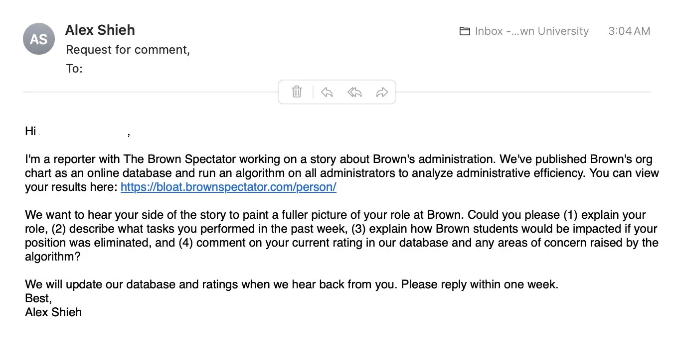 In addition to the email, Shieh linked recipients to a website he created called Bloat@Brown, which allowed users to search for administrator names to see whether their jobs were flagged as illegal DEI roles or whether they had been associated with antisemitism. Some of the site’s functionality—such as the antisemitism filter—has since been disabled.