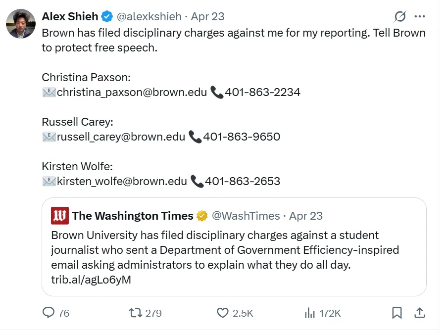 Now, Brown University is aggressively pursuing disciplinary action against Shieh. According to the Foundation for Individual Rights and Expression (FIRE), the school falsely claims that Shieh misrepresented himself as a student journalist—even though he is one.